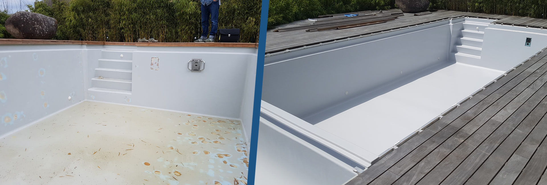 Dans le cas d’une coque de piscine en polyester, c’est plus compliqué, surtout que des études en collaboration avec un célèbre fabriquant de piscines ont démontré que, dans la majorité des cas, la source du problème (entrée d’eau) ne provient pas de la couche de gelcoat en contact avec l’eau de baignade mais bien de la partie de la structure en contact avec le sol !